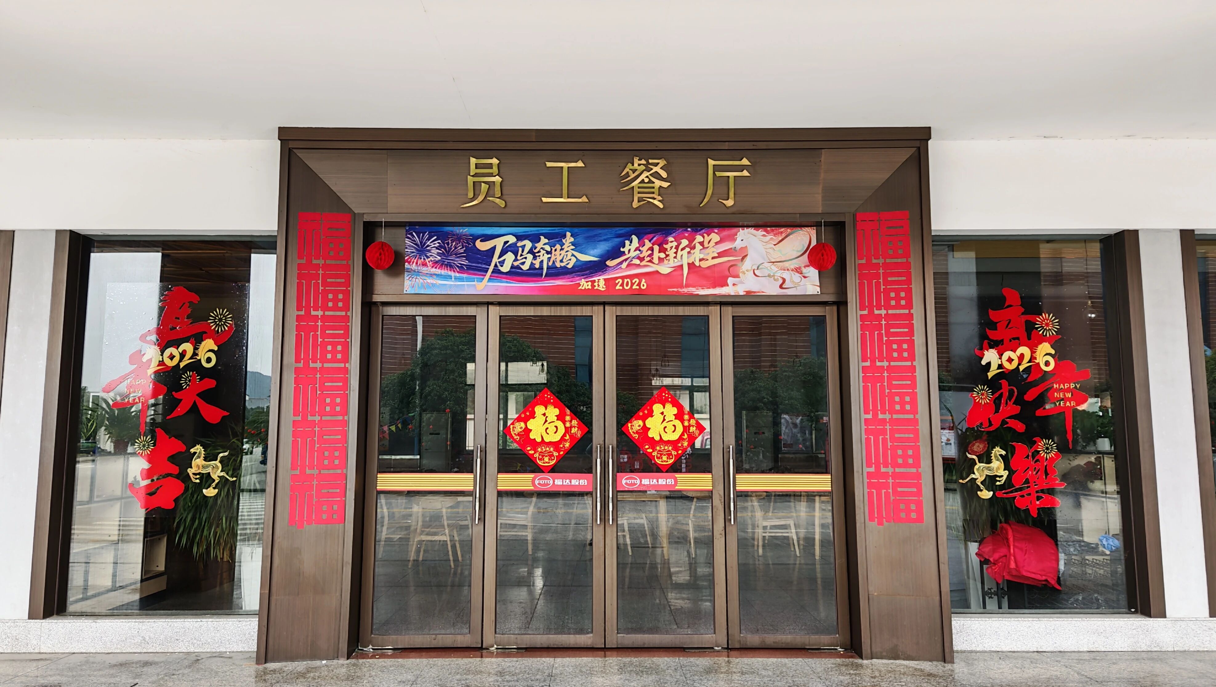 在公司大門口,懸掛四盞大紅燈籠,擺放果實累累的年橘;在辦公樓和員工餐廳前,張貼福字和馬年創(chuàng)意貼紙,還擺放金黃飽滿的年橘;在辦公樓內,擺放馬年主題創(chuàng)意裝飾盒,懸掛馬年祝福條幅和精美的中國結;在主干道兩旁的樹木上,掛了成串的小燈籠。從大門到車間,從室外到室內,每一處都傳遞了對新年的祝福,都凝聚著福達人對未來的憧憬與熱愛。